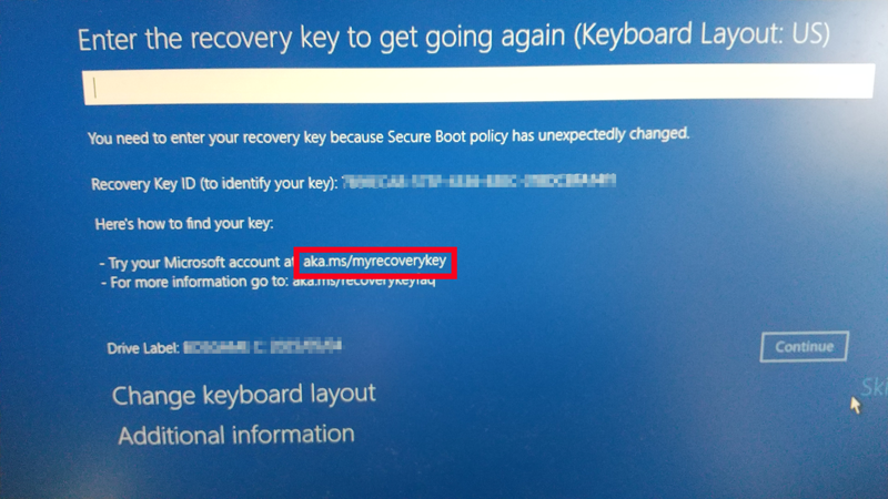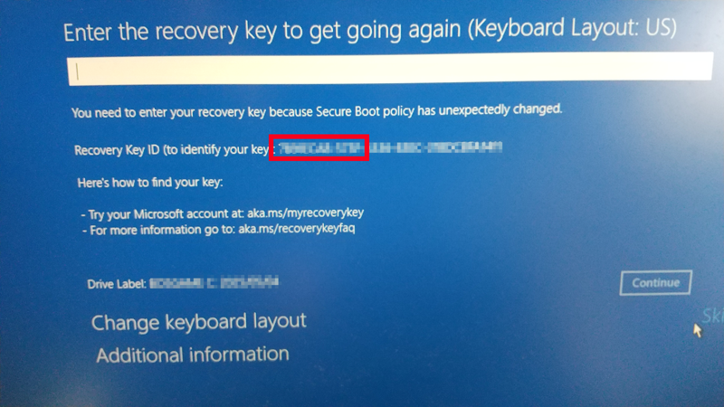 Bitlockerはドライブ暗号化技術として以前からWindowsに採用されていますが、一般ユーザにそれほど認知されているとも思えず、かつ、いつのまにかデフォルトでオン設定になっているようなので今後この画面が出るという問い合わせが増えそうです。ここでは回復キーの確認方法について記しておきます。