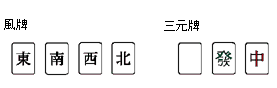 - ご存知かとは思いますが、麻雀には字牌(じはい、ツウパイ)と呼ばれる牌が7種類あります。これらはそれぞれ、風牌(かぜはい、フォンパイ〜東、南、西、北がこれにあたる)と三元牌(さんげんぱい〜白、発、中がこれにあたる)という2つのカテゴリに分けられます。