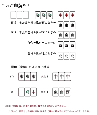 - 具体例を挙げますと、場が東場で自分が西家の時、そのプレイヤーは風牌の「東」と「西」を翻牌として使うことができます。場が南場で自分が北家の時は、もちろん「南」と「北」がその人の翻牌ということになります。また、東場で東家の時は「東」が、南場で南家の時は「南」が、それぞれ「連風牌」(レンフォンパイ)となり、通常の翻牌と同じように3つ集めると、2翻役に相当する翻牌となります。「ダブ東」とか「ダブ南」というのは、要するにこの連風牌を使った役のこと、あるいは、その連風牌そのものを指すものです。