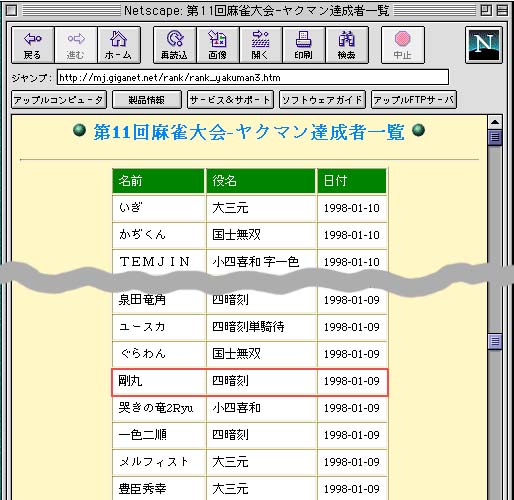 ふっふっふ。すまねえな。あと2週間になったからもう役満和了ることも無いと思ってページ作っちまったら、ほんとにほんとの土壇場でもう一回国士和了っちまって仕方がねえから後から追加したってわけさ。最終的なポイントは年間11ポイント・10回だ。これは、あくまでDAME雀年間レースの中での回数で実際はこれ以上和了ってるんだぜ。