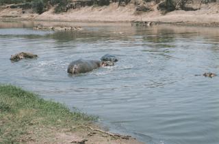今日は朝からピタとドイツ人のおっさんと3人でゲームドライブに出かける。初めこそ昨日と同じ動物が殆どいない草原が続いたが、タンザニアの国境が近づくにつれ、驚くほど膨大な数の動物達が出迎えてくれた。 例えばシマウマなどは、広がるサバンナ一面に群れをなしその数は数百を越える。お目当ての1つであった象やキリンといった大型の草食動物の群れにも会うことができた。 しばらく走ると車はタンザニアとの国境地点に到着する。国境といっても石碑がただ1個ぽつんとあるだけで他には何もない。そこにはKとTという文字が刻まれ間に一本棒線が引かれているだけ。おそらくこのKというのがケニア、Tがタンザニアを指しているのだろう。 僕達はタンザニアのビザを持っていなかったので、ここで曲がってさらに川の方へ向かいひた走る。 川辺に着いて車を降りる。するとベレー帽を被ったレンジャーが近づいてきて護衛をしてくれるとのこと。肩に担いだライフルが光る。 一緒に川岸を歩いて行くとカバの群れに出会った。しかし皆水につかっており、目と鼻、そして耳だけが出ているだけ。 おっさんが姿を見せてくれと叫ぶが当然ながら反応なし。How much!と陽気なジョークをカバ達に投げかけている。 しかししばらくしてレンジャーとおっさんが何やら話しをしている隙に、カバ達がいきなり雄たけびをあげて立ち上がってじゃれあった。 僕は偶然カメラを構えていたので、それをパチリ。おっさんも慌ててカメラを構えるが時すでに遅し、カバ達はまた元の水の中へ入ってしまっていた。 レンジャーがJapanese is lucky , German is unluckyと言って笑った。