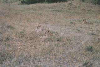 昼食後、まだ見ぬライオンを追い求めて走りまわるが、昼間ライオン達は茂みの中で寝ているとのこと。あまりにも暑かったので少し走って近くにあるロッジのバーで一休みする。 さすがは高級ロッジ、殆どリゾートホテルと化していた。2時間程3人で雑談し、その間にコーラを3本飲んだ。1本あたり70ケニアシリング、約110円。ここの物価は日本と殆んど変わらない。 夕方になってちょっと涼しくなったので、ゲームドライブを再開する。しかしやはりライオンは見当たらない。 それでも広がる大草原に群れをなす草食動物の姿は美しい。キリンも10数頭群れをなしていた。ちょっと感動。 ライオンは見れなかったけど、これでもう十分満喫したと思っていたところに、少し離れた場所にサファリカーが4〜5台止まっているのが見えた。 ピタが言ってみようと呟き、そこへ向かって車を走らす。 すると、いた!ライオンが2,3,4、、、6頭。横になって休んでいる。フィルムは後3枚だったが一応1枚パチリ。
